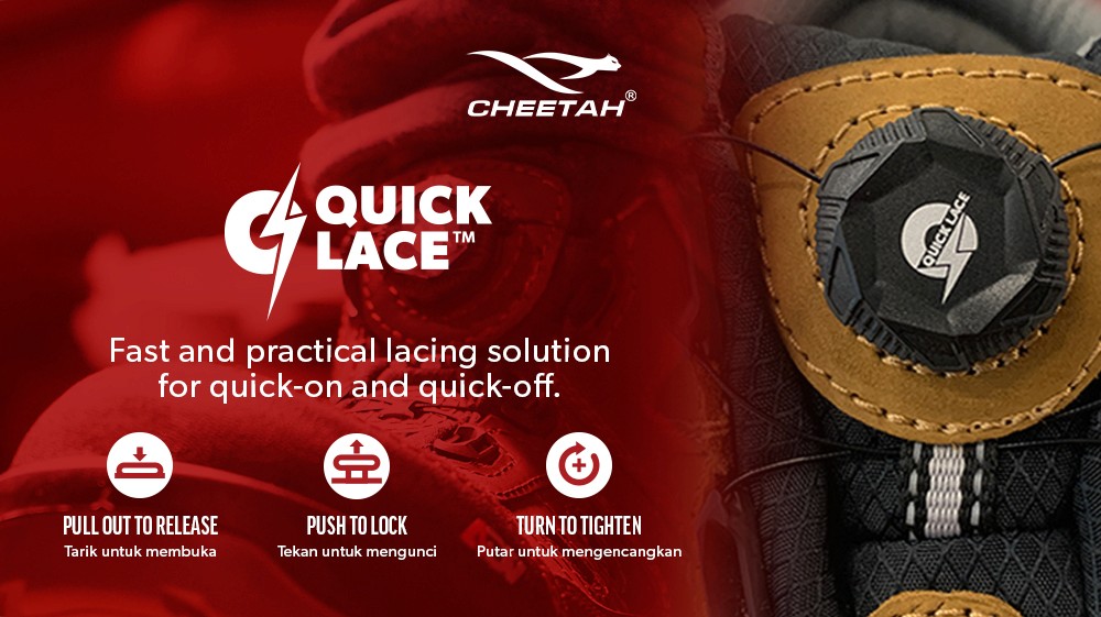 Tahan Banting di Medan Ekstrim Tali sepatu kain kalau kena lumpur, air, atau oli pasti jadi berat dan susah dibuka. Kabel Cheetah QuickLace anti-air dan tahan kotoran. Jadi, meski kamu kerja di tempat berlumpur sekalipun, sistem pengikatnya tetap lancar jaya buat dibuka-tutup.